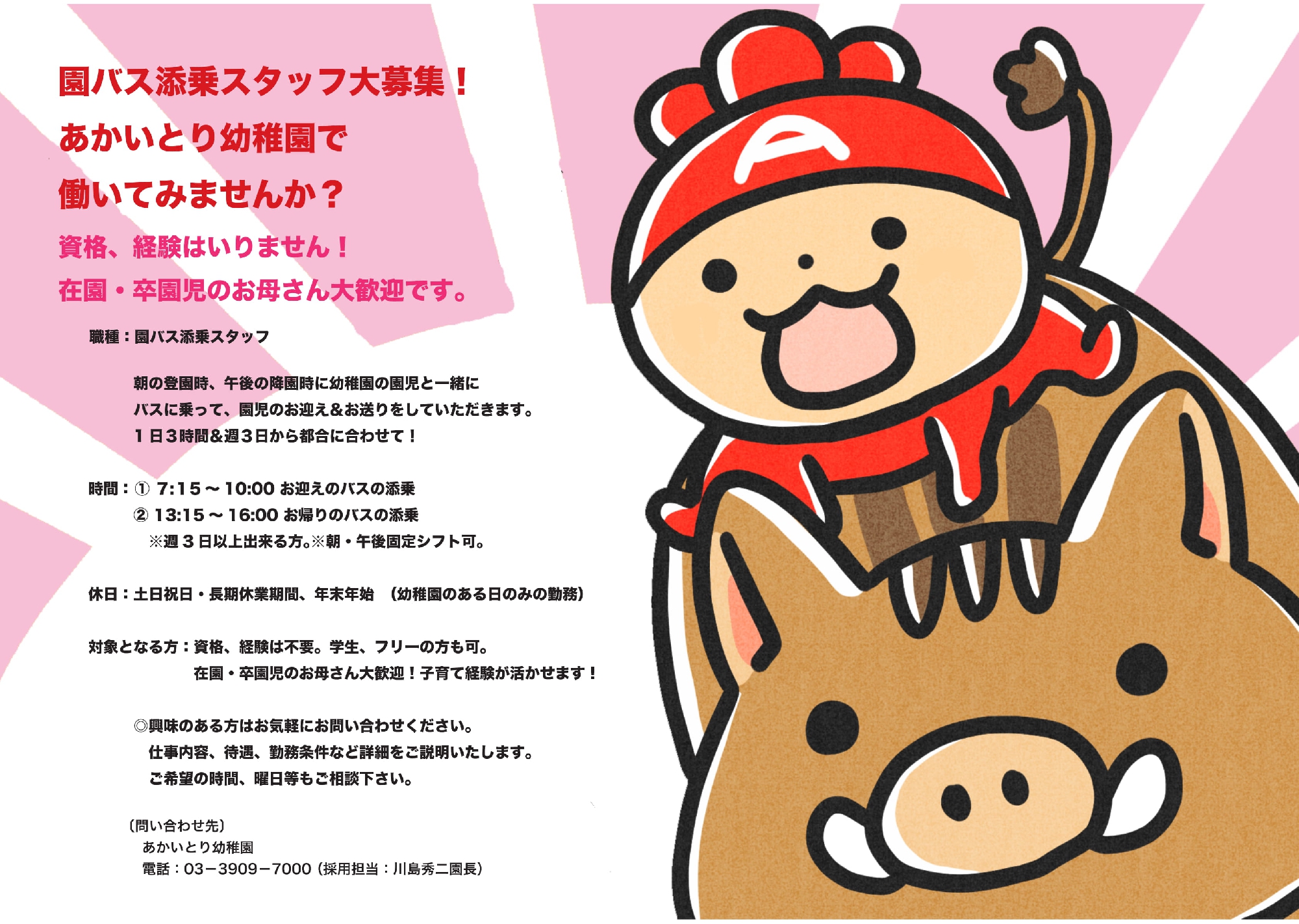 東京都北区赤羽にあるあかいとり幼稚園では、子どもたちに少しでも充実した園児生活を送っていただくため試行錯誤し、「幸せな子ども」がいっぱいの園を目指しています。まずはお気軽にお問い合わせください。